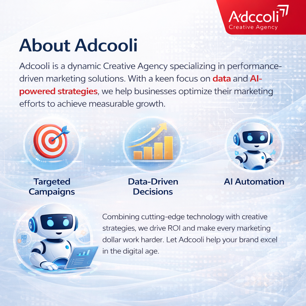 Adcooli is a dynamic Creative Agency specializing in performance-driven marketing solutions. With a keen focus on data and AI-powered strategies, we help businesses optimize their marketing efforts to achieve measurable growth. From targeted campaigns and data-driven decisions to AI automation, Adcooli is committed to driving ROI and ensuring every marketing dollar works harder.